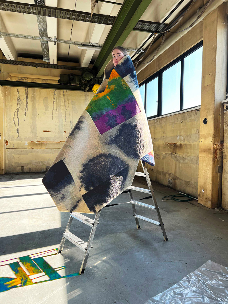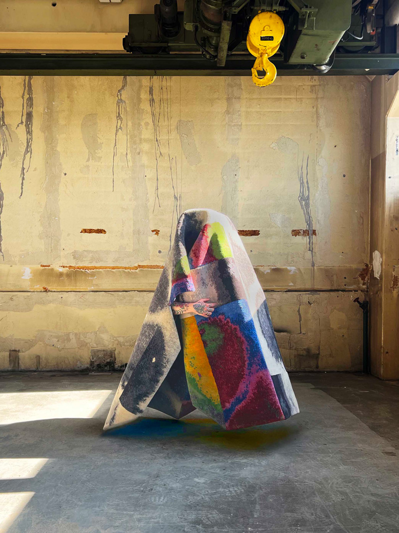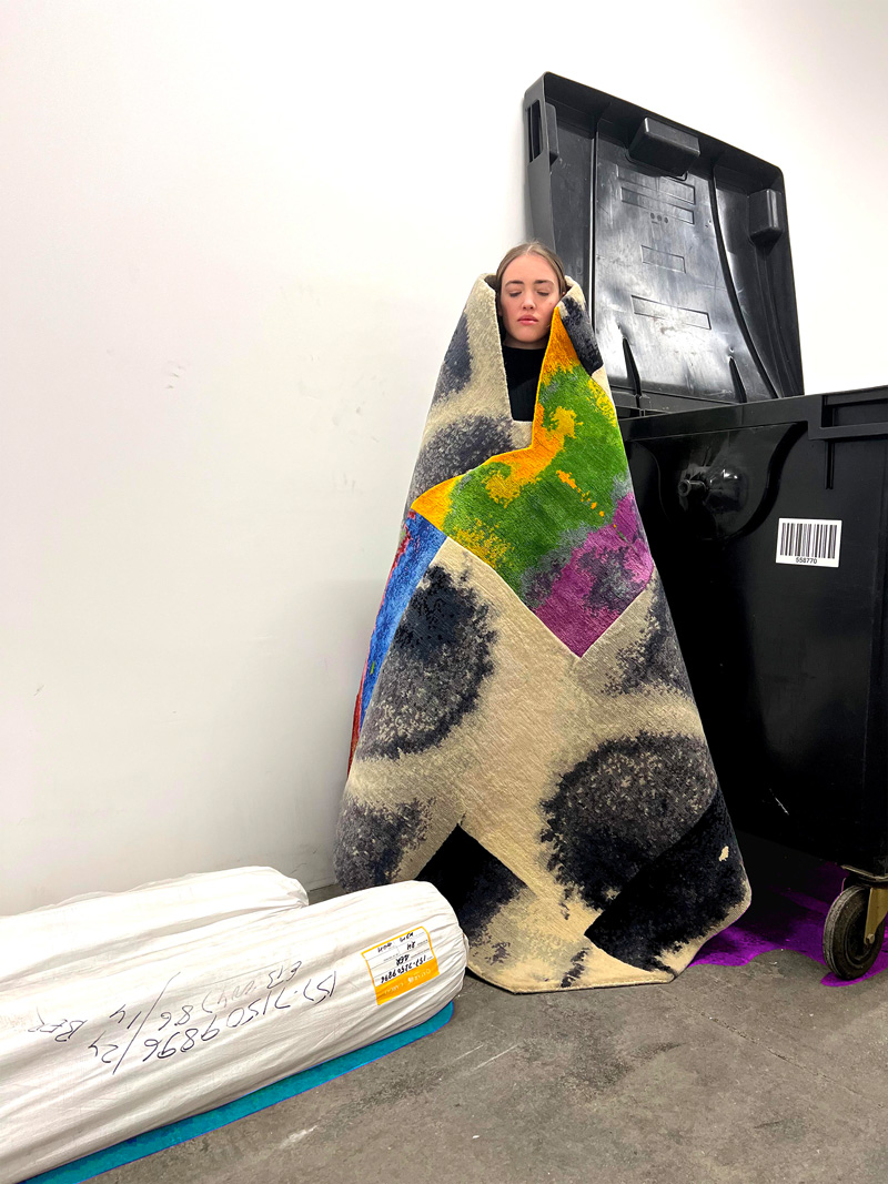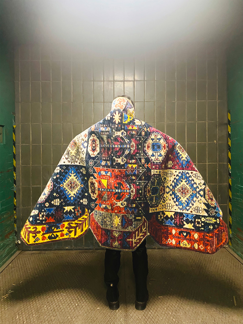 Whenever we see an abandoned space, we stop and throw a hand-knotted rug over our heads; the rest comes automatically in the moment’s emotion. Of course, I love the work of Caroline Saage, with whom we also created the KingsRobe campaign in Berlin and Jaipur in the village of the weavers, where we shot our contemporary rugs as robes wrapping our bodies. But to be honest, any of you can do it with a phone, as snapshots have their performative beauty, and this is the aesthetic we are talking about.