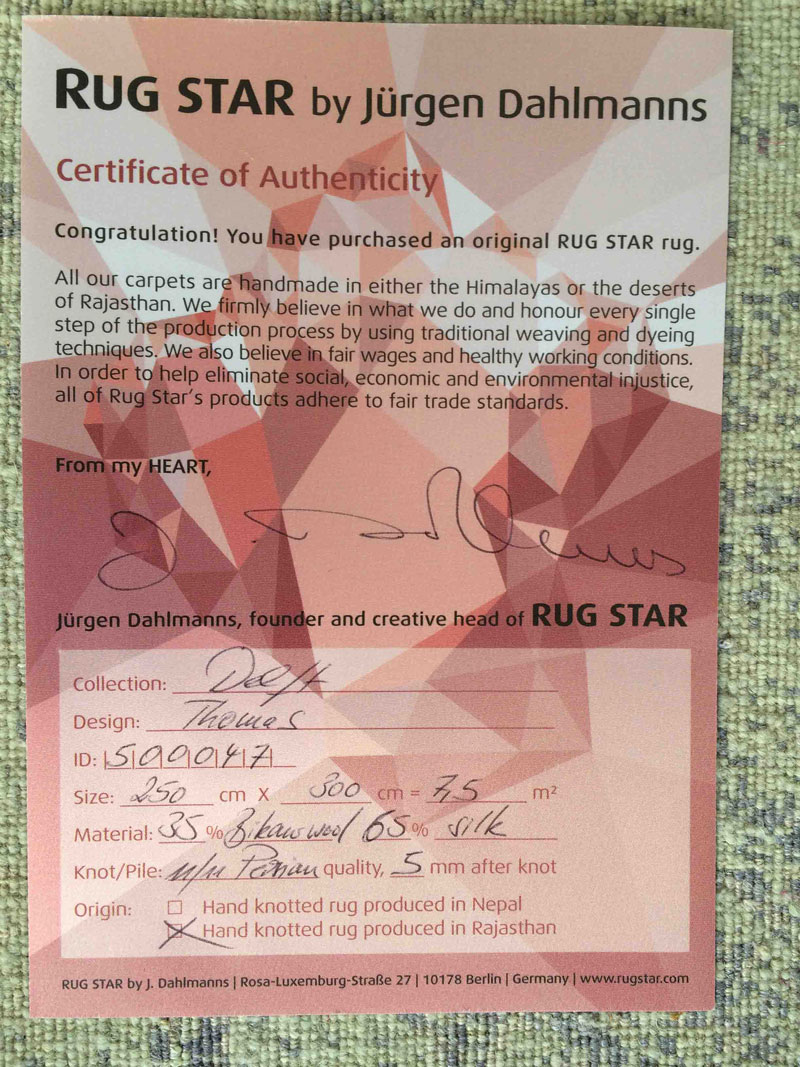 Our contemporary modern rug art is produced in Rajasthan, India, as a hand-knotted Persian weave in 11/11 knot quality in a nice blend of wool and silk. The surface is beautifully hand-trimmed to one-level pile height.