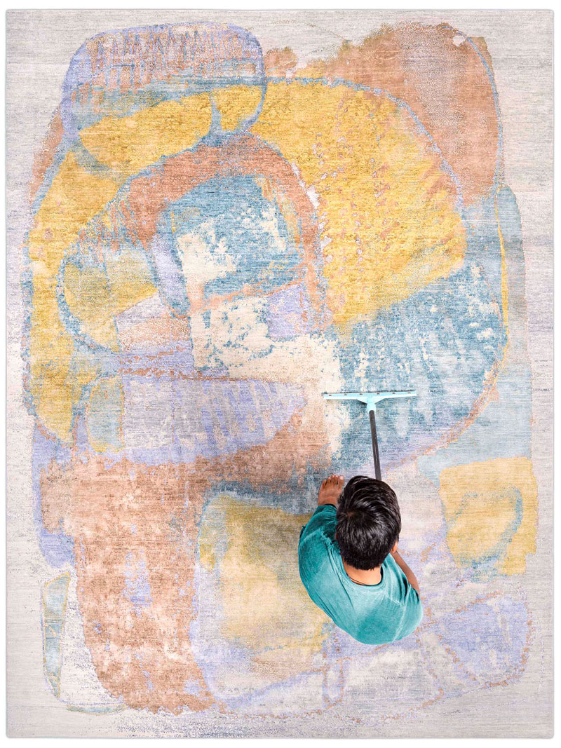 Our contemporary modern rug art is produced in Rajasthan, India, as a hand-knotted Persian weave in 9/9 knot quality in a nice blend of wool and silk. The surface comes in a beautiful velvet sandblasted execution.