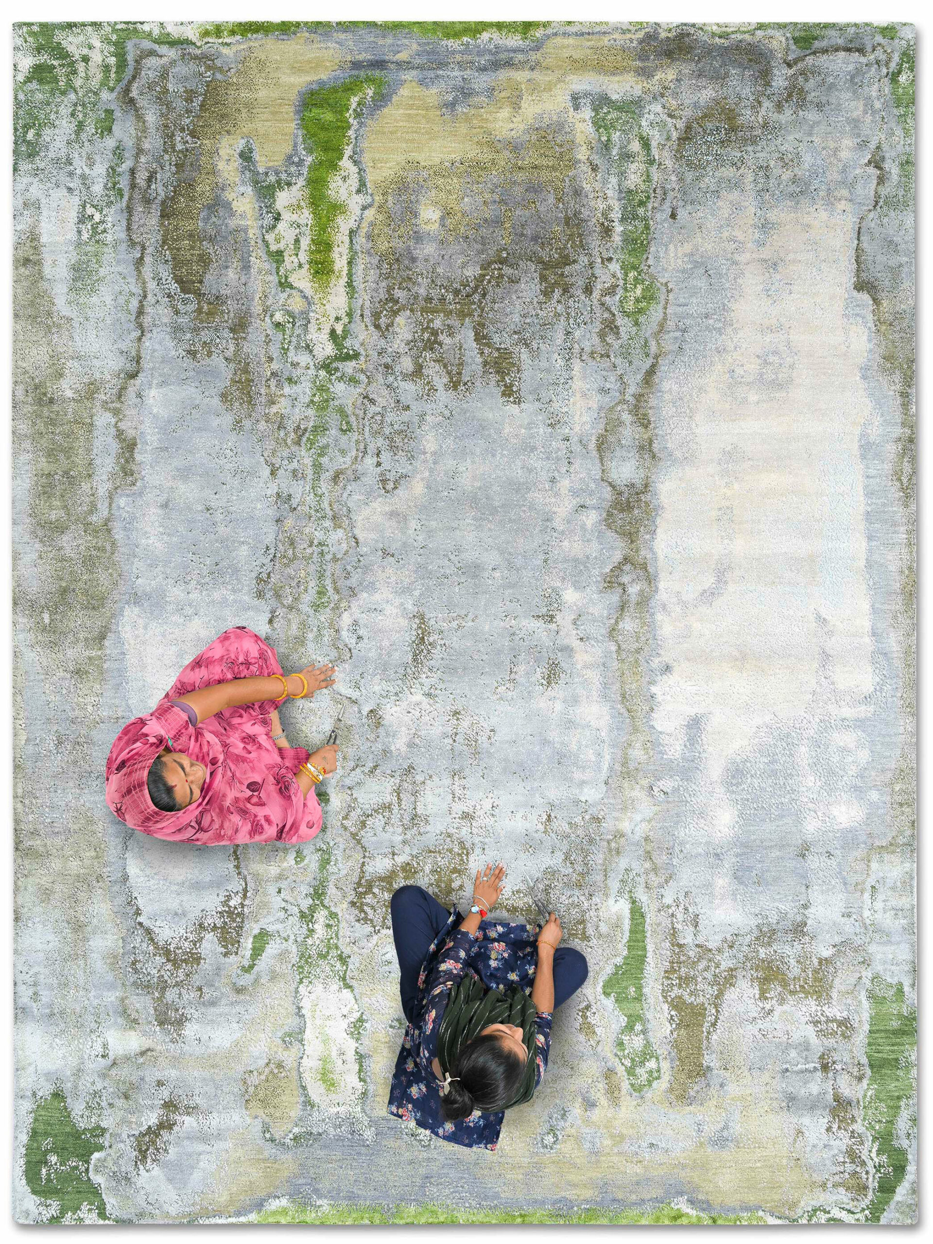 Our contemporary modern rug art is produced in Rajasthan, India, as a hand-knotted Persian weave in 9/9 knot quality in a nice blend of wool and silk. The surface comes in a high/low texture, where we clip down particular wool fields to create a topography of material and texture.